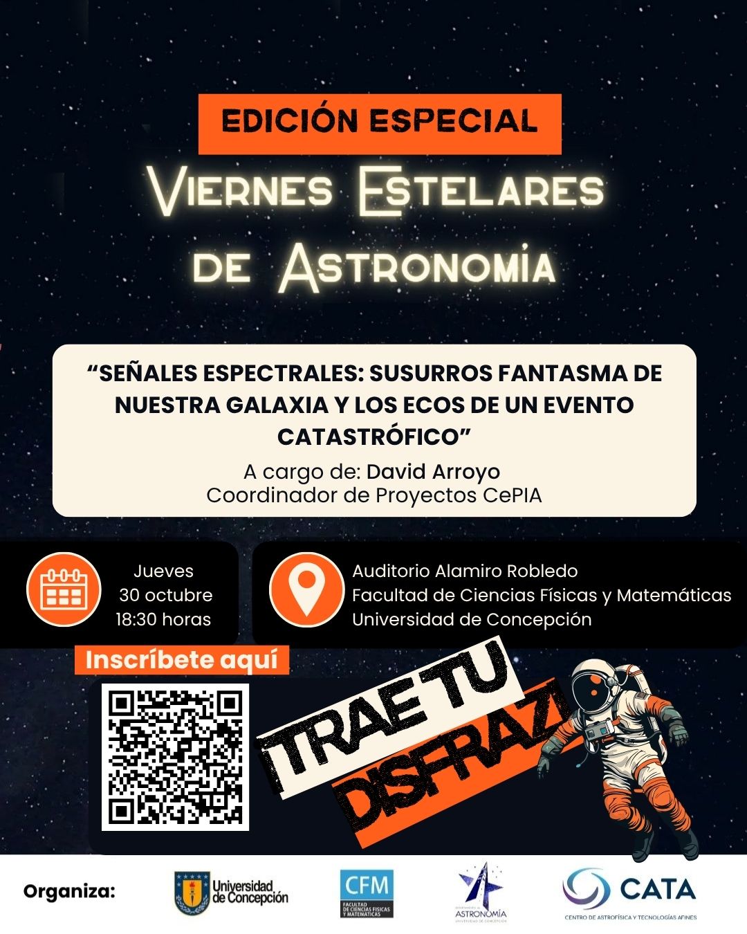 El tradicional ciclo de charlas del Departamento de Astronomía UdeC se adelanta al jueves 30 de octubre con una edición especial que mezcla ciencia, misterio y disfraces. El expositor será David Arroyo, ingeniero civil electrónico y coordinador de proyectos CePIA.